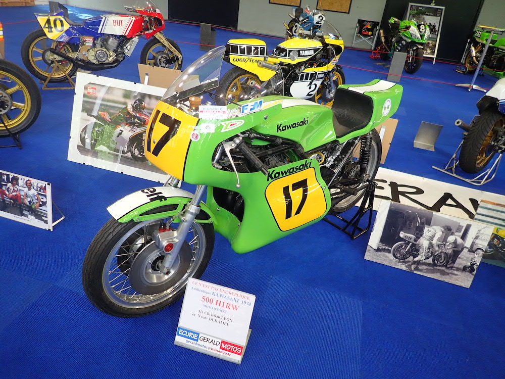 Encore une pièce rare : la 500 Kawasaki d’Yvon Duhamel avec laquelle il n’a fait que le GP de France à Charade en 1974. La machine (assez classique) n’était pas compétitive face aux MV, Yam et la toute nouvelle Suzuki RG500…